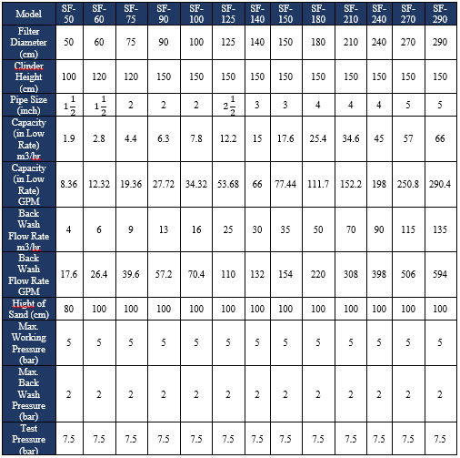 جدول مشخصات فیلتر شنی | صافی شنی: